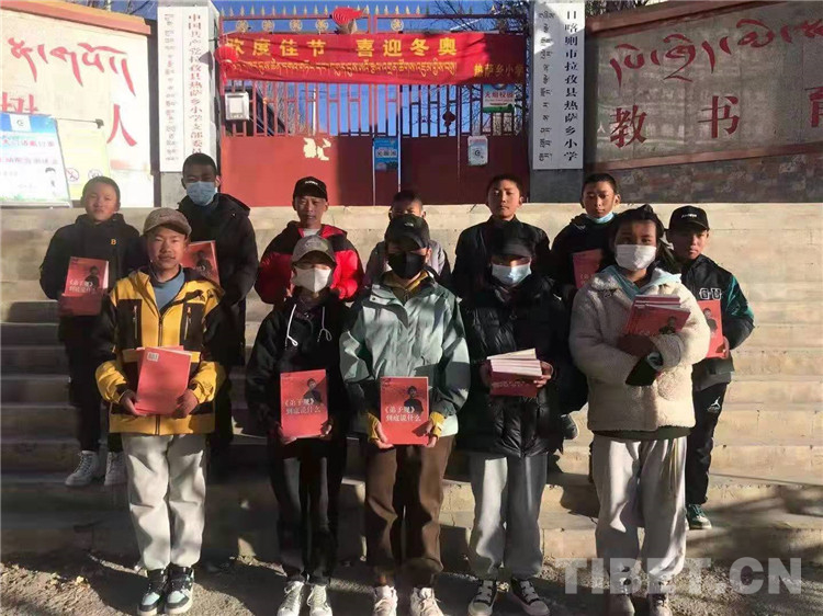 圖為拉孜縣熱薩鄉小學學生展示受捐圖書