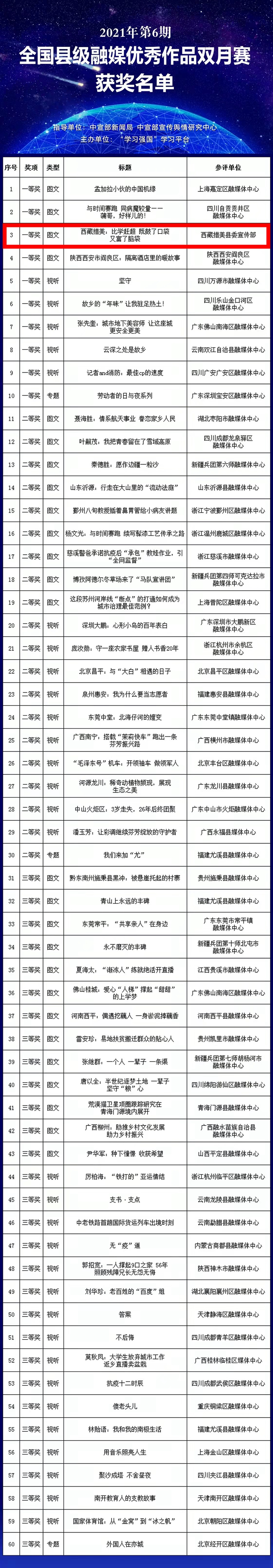 據了解,2021年第6期全國縣級融媒體中心優秀作品雙月賽由中宣部新聞局、中宣部宣傳輿情研究中心指導,“學習強國”學習平臺主辦,各省(區、市)和新疆生產建設兵團學習平臺協助組織、共同實施,各省級學習平臺對投稿作品進行初評,評選出299件優秀作品,“學習強國”學習平臺組織專家評審團隊對優秀作品進行復評、終評,最終評選出60件獲獎作品。