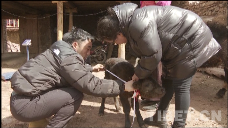 圖為貢覺縣畜牧站工作人員給村民索朗桑布指導飼養保暖措施