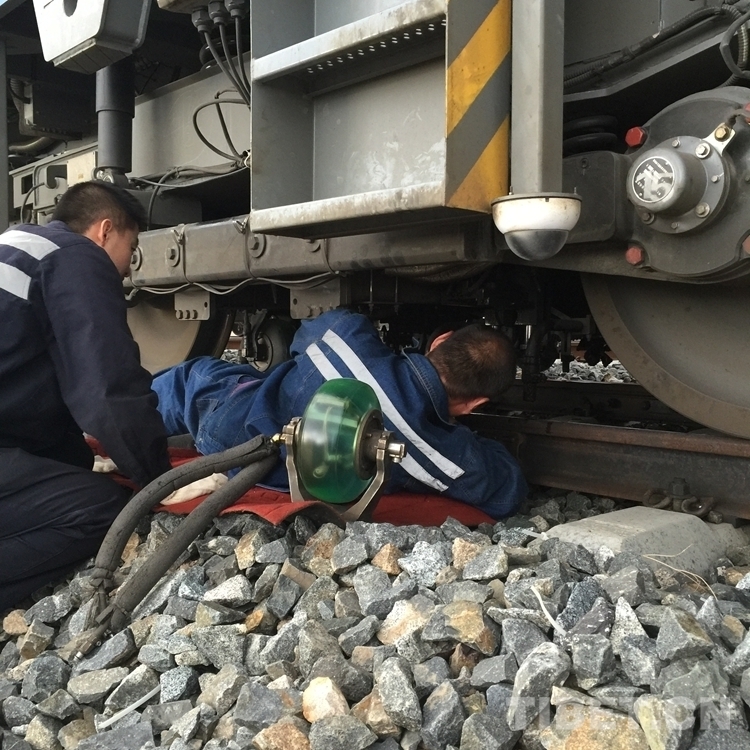 即將達(dá)到加查站時,探傷員余賢明發(fā)現(xiàn)探傷車左側(cè)第2個探輪有破損現(xiàn)象,需要更換探輪,大家立刻按照分工各就各位。隊長聯(lián)系集團公司調(diào)度、加查站安排探傷車??寇囌?,設(shè)置好防護(hù)后,李生紅和余賢明立即鉆到車下拆卸破損探輪,崔成剛和李慧臣則準(zhǔn)備好新的探輪。四個人分工協(xié)作,在夜幕降臨之前將新的探輪安裝了上去。