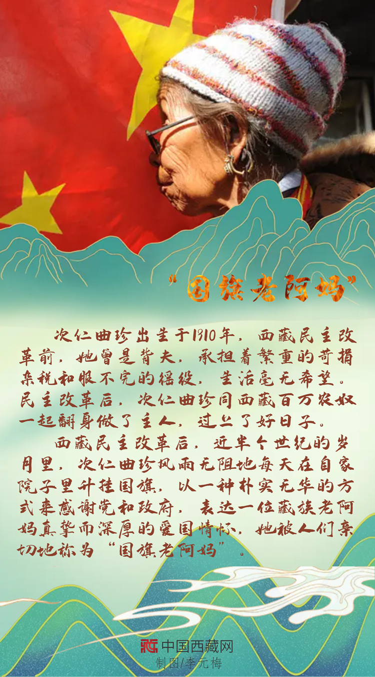 西藏民主改革后,次仁曲珍在自家院子里升起國旗,這一升就是近半個(gè)世紀(jì),一天不落,風(fēng)雨無阻。只有經(jīng)歷過舊西藏的人才知道新西藏的可貴,翻身成為國家主人的“國旗老阿媽”,以上萬天堅(jiān)持不渝的行動表達(dá)著自己樸素的愛國情懷。