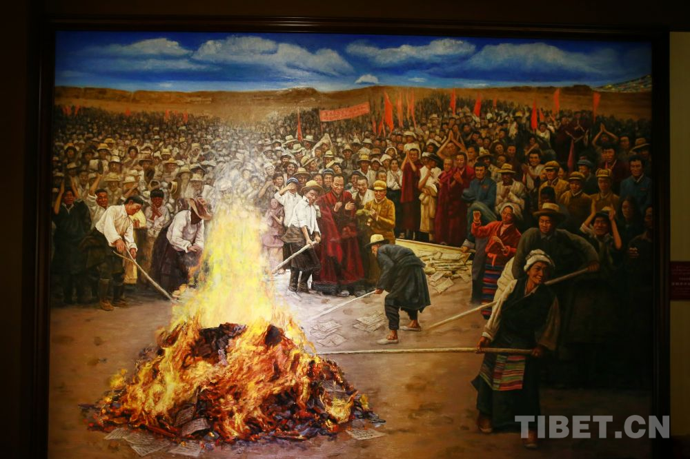 1959年3月,西藏開始實(shí)施民主改革,圖為達(dá)孜縣翻身農(nóng)奴正在焚燒契約和債券文書 翻拍:許娜