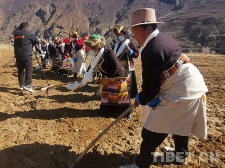 活動現場,群眾頭戴藏式金花帽,身著氆氌藏裝,或手持犁耙和鋤頭,或開著拖拉機,以吃切瑪、敬青稞酒、獻哈達、跳鍋莊、犁地、播種等傳統習俗,隆重慶祝共康村首屆開耕節。