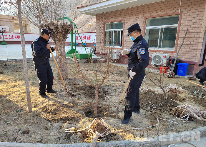 勞動中,該執勤點民警積極參與,從挖坑到樹苗的排列、扶正、培土、踩實、澆水各個環節分工到位,呈現出一派熱火朝天的植樹景象。