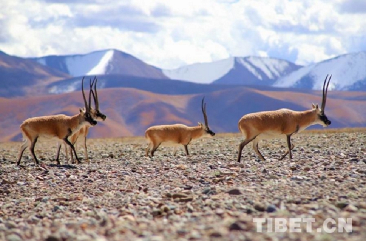 圖為那曲市境內雪山下正在遷徙的藏羚羊 攝影:王魯鎮