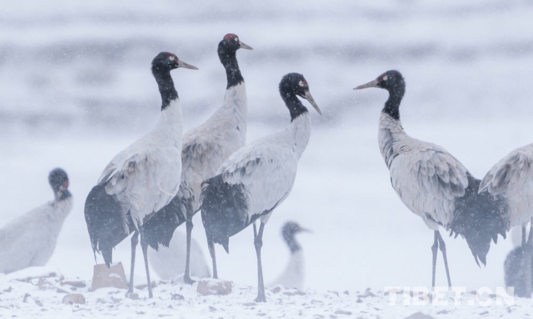 圖為在拉薩市林周縣虎頭山水庫附近越冬的黑頸鶴無憂無慮地覓食 攝影:趙耀