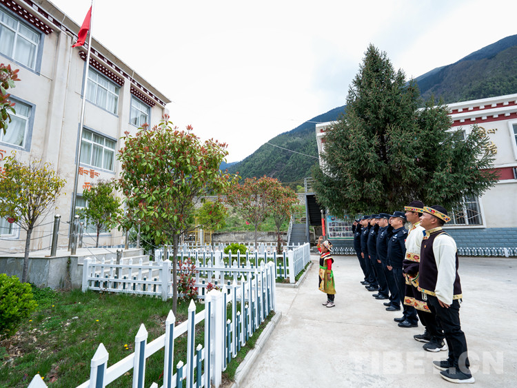 來自派鎮雪卡村的5歲小女孩旦增玉珍在林芝邊境管理支隊派邊境派出所,與移民管理警察共同參加升旗儀式。還在上幼兒園的她,像學校里的哥哥姐姐們一樣,一邊敬禮一邊唱國歌,同派出所民警一起接受愛國主義熏陶。