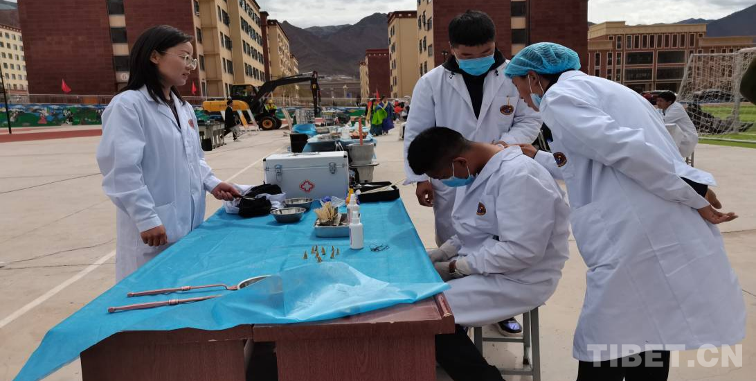 藏醫藏藥專業的同學們在老師的指導下,有條不紊地進行著火灸,三兩個同學一起配合,在“患者”頸部選定穴位,點火,看火,直至火焰熄滅,一次火灸時間為10至15分鐘。在火灸演示后方,同學們正展示著藏藥足療,濃郁的藥草味、熟練的手法盡顯藏醫養生療法特色。
