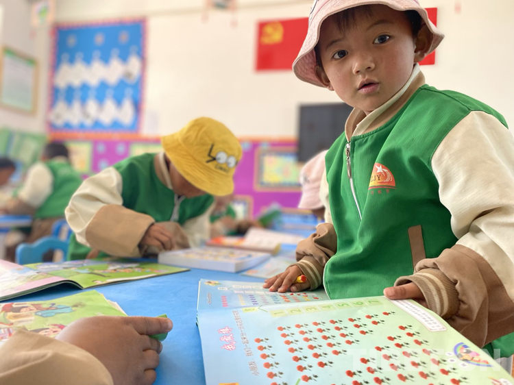 圖為西藏自治區日喀則市桑珠孜區江當鄉雷貴村幼兒園孩子們翻閱書籍 攝影:王媛媛
