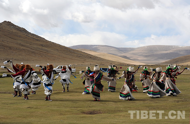 這是班戈縣諧欽民間藝術團的年輕舞蹈演員,在家鄉的班戈草原跳起歡快的“鍋莊”(圓圈舞)(唐召明2015年5月21日攝)