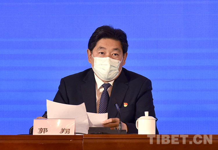 圖為西藏自治區新型冠狀病毒肺炎疫情防控工作第四場新聞發布會上,西藏自治區經濟和信息化廳黨組成員、副廳長、一級巡視員郭翔介紹疫情期間防疫物資保障情況 攝影:王媛媛