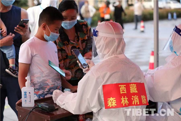 圖為西藏自治區林芝市森林消防支隊消防員在核酸采集點查看群眾健康碼