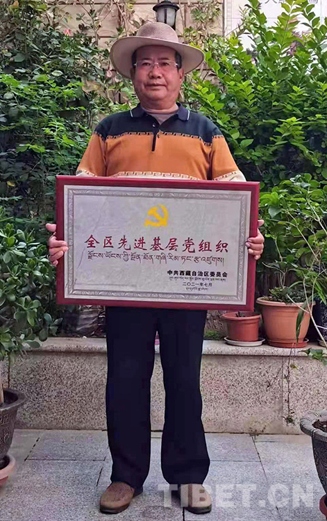 這是現(xiàn)任那曲駐拉薩第十退休黨支部書記加央多吉,手捧2021年所榮獲的中共西藏自治區(qū)委員會(huì)頒發(fā)的”全區(qū)先進(jìn)基層黨組織“獎(jiǎng)牌拍照留念(唐召明提供,2021年7月份攝)