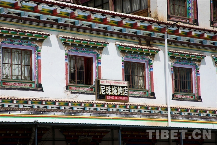依山而建的藏式三層小樓里,丁增拉姆將房屋裝修得華麗亮堂,墻壁上繪有吉祥圖案,天花板與地板相接的立柱滿是精致的雕刻和彩繪,掛著吉祥的哈達。門外小院臺階旁的葡萄藤密密地纏繞在架子上,成串果實掛在枝頭。單獨分離出來的廚房和餐廳,也是孩子們的游樂場,沐浴著陽光下棋、讀書,一片歡聲笑語??拷鼧求w的小小花壇自然隔開了生活區和商業區,一樓就是丁增拉姆家的尼珠燒烤店。沿著馬路的空地,搭建了長長的涼棚,夜晚在這里和三五好友吃著燒烤,吹著清涼的風,望著閃耀的星星,談談人生和理想,再舒服不過了。