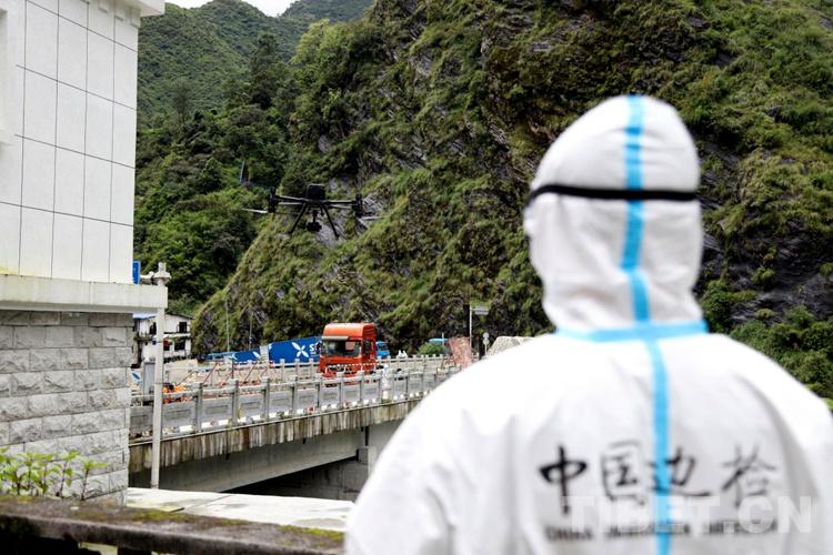 圖為民警正在使用無人機對貨運通關現場進行實時監測 攝影:尼瑪旦增