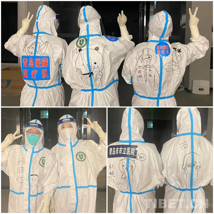 圖為青島“大白”們身著漫畫“戰袍”在日喀則戰“疫”一線合影留念