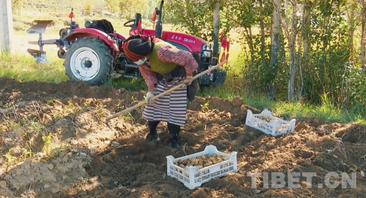 圖為唐嘎鄉窮達村村民在自家菜地里收土豆