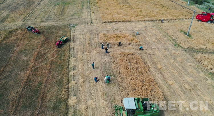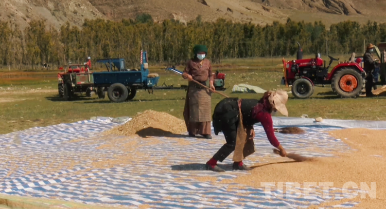在達孜區雪鄉扎西崗村,隨著機器轟鳴,一顆顆金色飽滿的青稞粒構成一扇彩虹門,有人在曬青稞、有人在裝袋、有人在搬運,一幅和諧的秋收圖展現在眼前。
