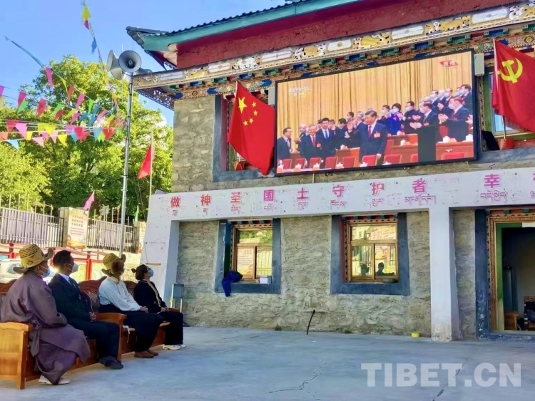 圖為西藏自治區林芝市朗縣朗鎮托麥村村干部通過電視大屏收聽收看黨的二十大開幕會 圖片由林芝市委宣傳部提供