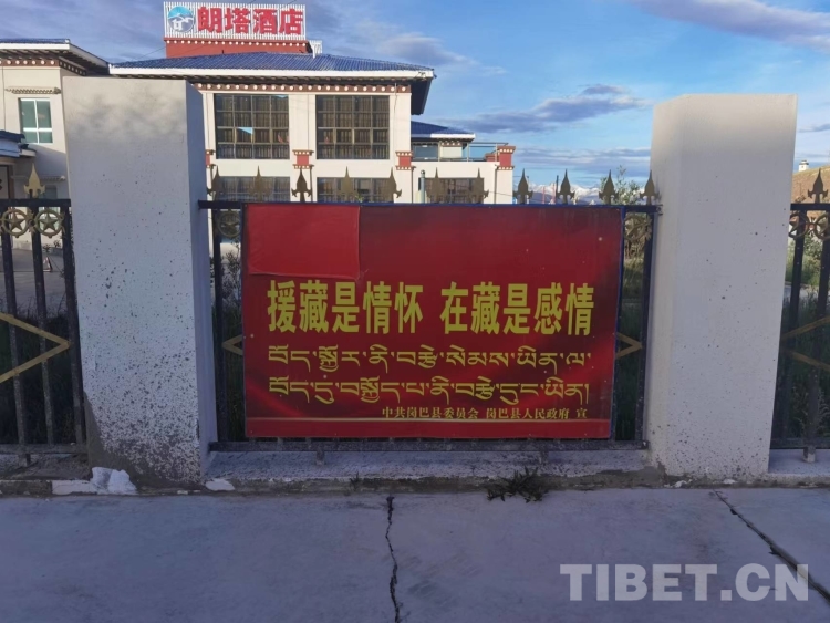 圖為崗巴縣城“援藏是情懷,在藏是感情”標語 (2022年7月拍攝)