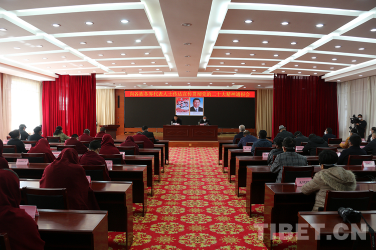 中國西藏網訊 11月18日,西藏自治區向各族各界代表人士傳達宣傳貫徹黨的二十大精神通報會在拉薩市召開,來自民族界、宗教界、黨外知識分子和新的社會階層人士、非公經濟界以及歸國藏胞約50位代表參加。