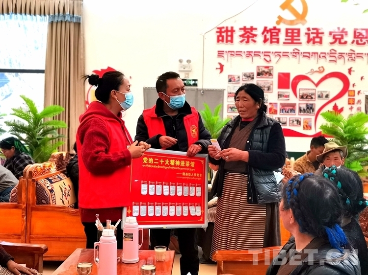 圖為山南市委宣傳部、山南市文明辦在文明實踐示范點開展黨的二十大精神進甜茶館志愿服務活動