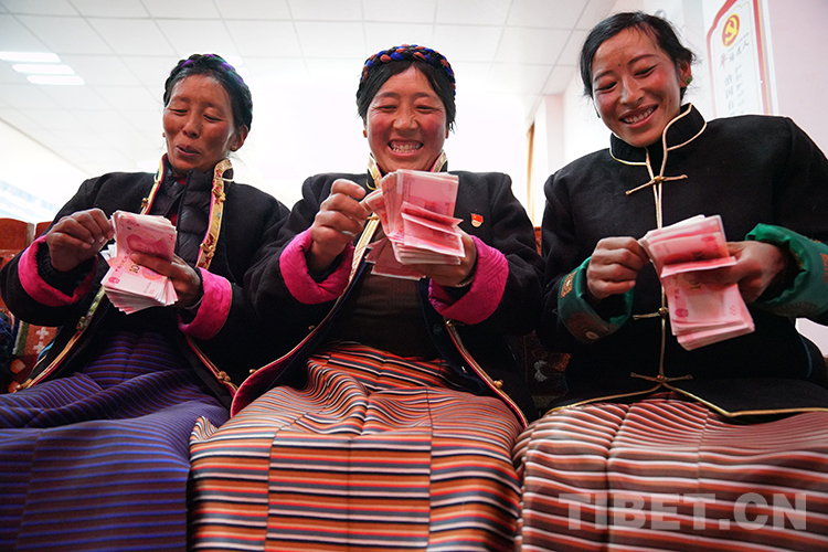 圖為領(lǐng)到工資的部分放牧員家屬正在數(shù)錢。攝影:曲杰
