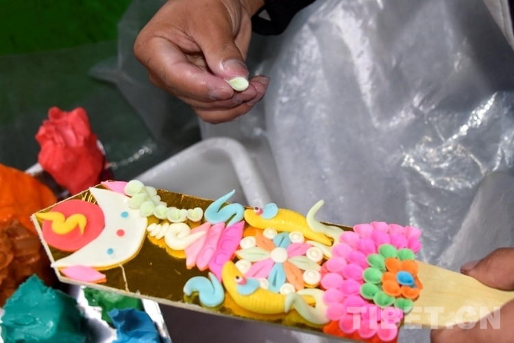 “我們一般在藏歷新年前20天左右到達拉薩。買酥油,和礦物染色原料調至成泥狀后便開始捏制。”旦增說,普松鄉有制作酥油花的傳統,每年藏歷新年臨近,他們便結伴來到拉薩制作酥油花銷售。