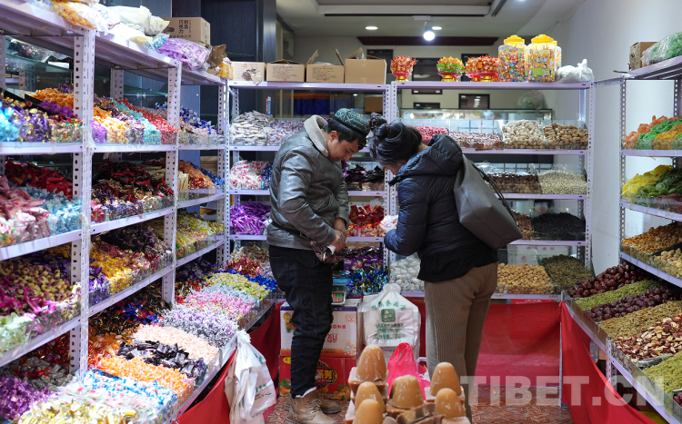 在八廓商城附近的一家門店里,來自新疆當地的和田大棗、天山沙棗、葉城核桃、大白杏干、馬奶子葡萄干、天山烏梅、巴旦木等,因食材地道、品質優良格外受到拉薩市民的青睞。老板是位“00”后維吾爾族青年,頭腦靈活,待人熱情,近日來持續火爆的生意更是讓他高興得合不攏嘴。上門購物的顧客有藏族、漢族、回族等民族,他們除了購買地道的新疆干果,還會購買該店專為藏歷新年新上的大白兔奶糖、彩色硬質水果糖、果汁軟糖、巧克力、棒棒糖、藏式奶渣等貨品。人們用漢語加手勢比劃著交流,溝通無礙,再加上移動支付方便快捷,老板誠信經營,顧客們總能高興而來,滿意而歸。