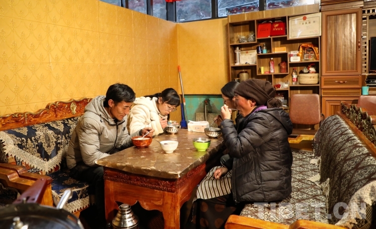 “古突”煮好了,扎西一家人圍坐在桌邊。“妹妹肯定會(huì)吃到辣椒,姐姐可能會(huì)吃到石頭。”阿媽尼瑪拉宗在吃“古突”前和姐妹兩人開玩笑,一家人相互打趣,有說(shuō)有笑,其樂(lè)融融。