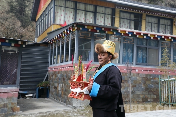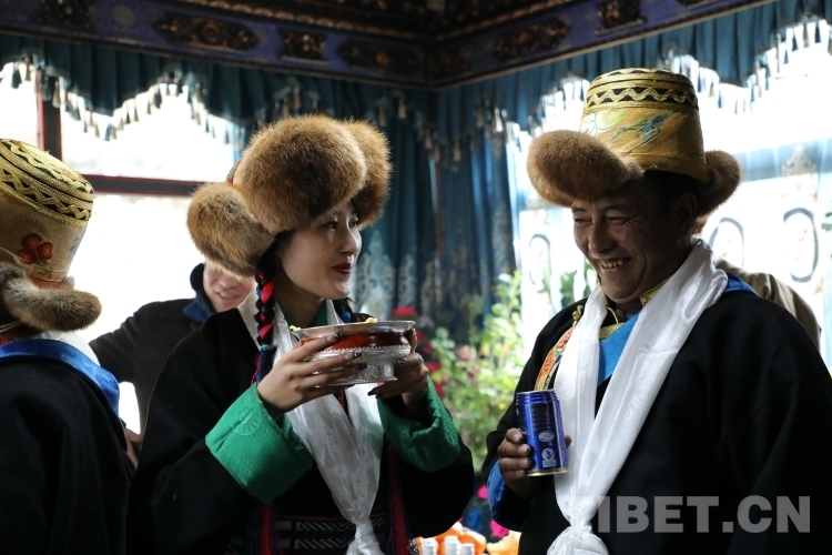 天亮以后,扎西江村一家人穿上新衣服,輪流敬切瑪、喝青稞酒,互道“扎西德勒”。扎西江村家的小女兒達娃倉決吃切瑪的時候,先用拇指和食指抓起一小撮糌粑灑向空中3次,表示敬天地,然后把糌粑放進自己嘴里。喝青稞酒也同樣如此,要先用雙手接過酒杯,然后左手拿杯,右手無名指輕輕地在杯中蘸酒,彈向空中,如此反復三次。