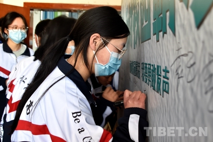 圖為學生們依次在面對校園霸凌我要勇敢發聲簽名墻進行簽名 攝影:次旦拉姆