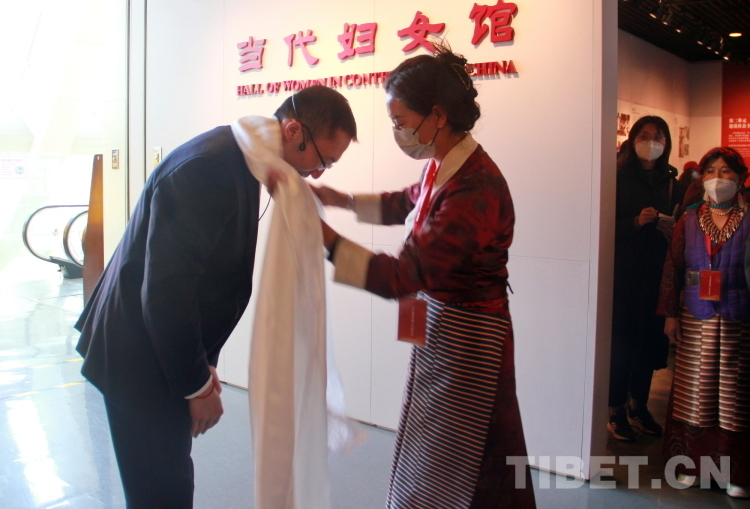 圖為“2023年西藏基層婦聯干部赴京學習參觀團”成員向中國婦女兒童博物館講解員獻上哈達 攝影:劉莉