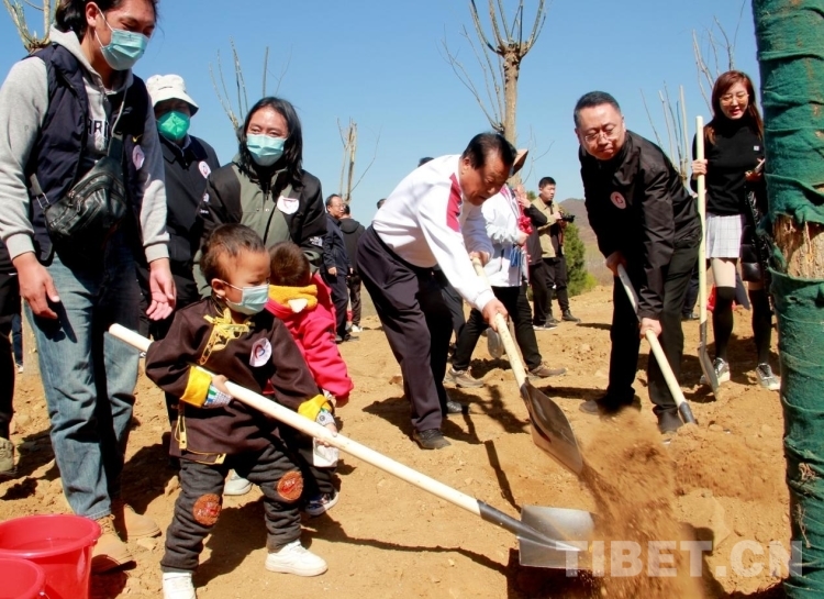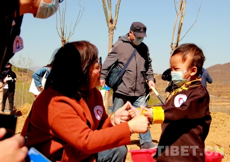 來自青海省果洛藏族自治州的多杰雖然才3歲多,但在掌握了鐵锨的使用后,他就成了整個植樹區域的熱心人,到處幫助別人鏟土,樂此不疲。圖為多杰正在幫助別人鏟土植樹 攝影:劉莉