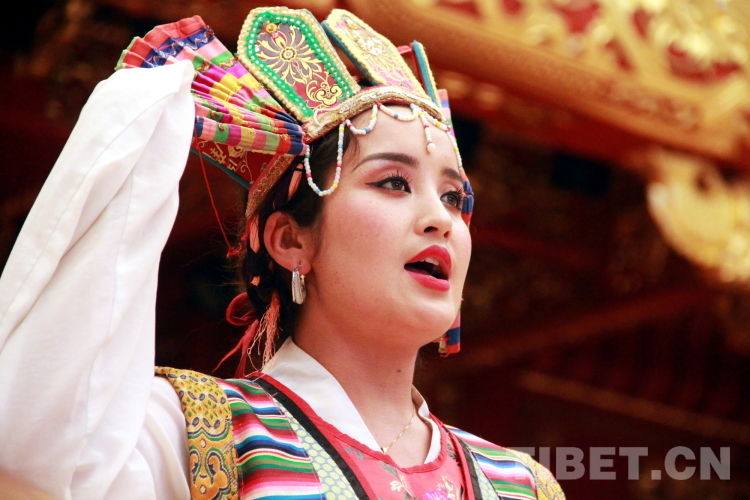 圖為拉薩市城關(guān)區(qū)娘熱民間藝術(shù)團(tuán)演員洛桑卓瑪表演藏戲開場(chǎng)《溫巴頓》片段 攝影:劉莉