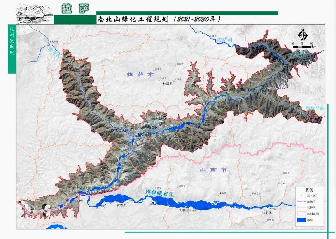 該工程以拉薩河為主線,以山體兩側第一重山脊可視范圍為重點,涉及拉薩市城關區、柳梧新區、堆龍德慶區、達孜區、曲水縣、墨竹工卡縣、林周縣和山南市浪卡子縣、貢嘎縣9縣(區)35個鄉鎮。自2021年至2030年,用10年時間完成營造林206.7萬畝,新增營造林面積約為現有南山綠化面積的600倍。
