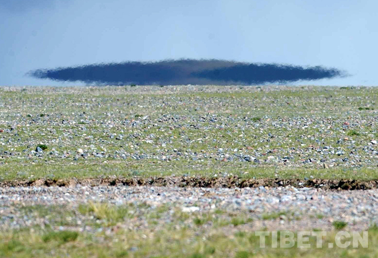 出現在羌塘國家級自然保護區的形似飛碟的海市蜃樓。海市蜃樓是因空氣中不斷升騰的水汽將光線折射而形成(唐召明2009年8月2日攝)