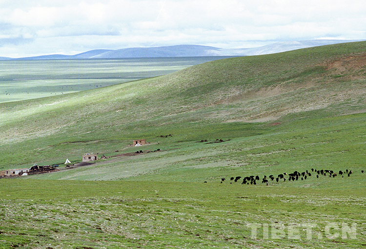 在雙湖特別區(現雙湖縣)草原上放牧的牦牛群與牧民人家(唐召明2001年攝)