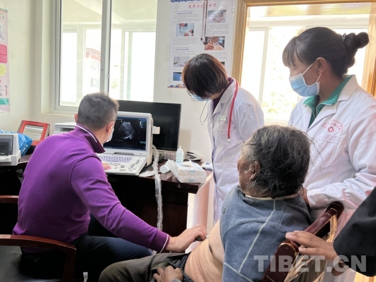 “彩超呢?”北京上地醫(yī)院院長張宇在衛(wèi)生院工作人員的帶領(lǐng)下來到衛(wèi)生院二樓為75歲的桑旦江措老人進(jìn)行胸部彩超檢查,“霍主任(中國中醫(yī)科學(xué)院望京醫(yī)院心內(nèi)科主任)懷疑他有心衰,患者不能平臥睡覺、走路氣喘、雙腿腫脹,所以我想通過超聲印證一下,昨天我們也篩查了一些有心衰跡象的群眾,平時大家覺得氣喘是小問題,忍忍就好了,實(shí)際上它還是很嚴(yán)重的,要及時治療。”張醫(yī)生告訴記者,“藏族群眾對骨科和胃腸道的關(guān)注度更高,但是心臟、血管、糖尿病等不會立馬表現(xiàn)出來的慢性病不太重視,這樣往往會錯過最佳的治療時間。所以我們應(yīng)該通過講座和培訓(xùn),一方面要增強(qiáng)群眾的健康意識,另一方面也要培養(yǎng)當(dāng)?shù)赜玫蒙稀⒘舻米〉募夹g(shù)型人才。”
