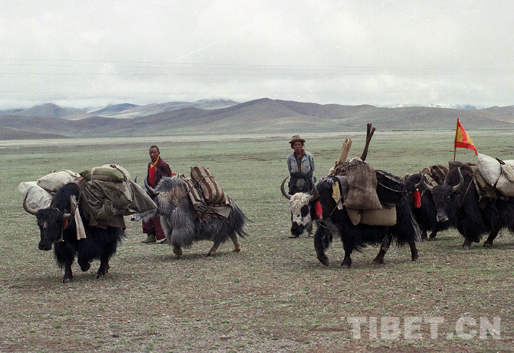 資料圖:藏北草原正在馱物運輸的牦牛群(唐召明1997年攝)