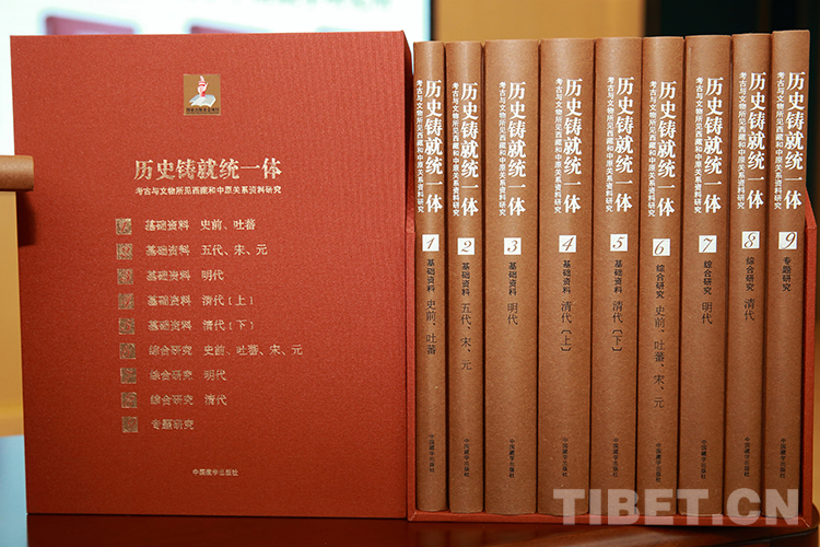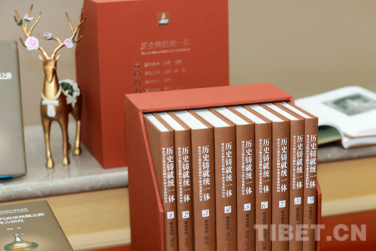 圖為發布會現場展覽的《歷史鑄就統一體:考古與文物所見西藏和中原關系資料研究》全套圖書 攝影:陳衛國