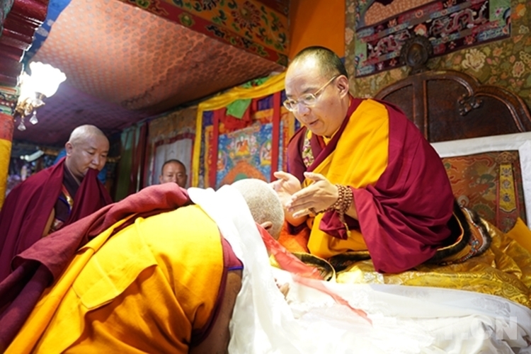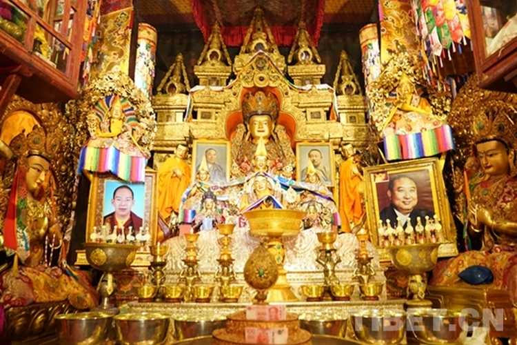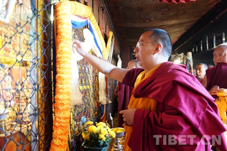 在措欽大殿,班禪虔誠叩拜供奉于此的佛祖釋迦牟尼佛像和藏傳佛教格魯派始祖宗喀巴佛像,與僧眾共同念誦經文,之后回到寢宮拉讓殿。