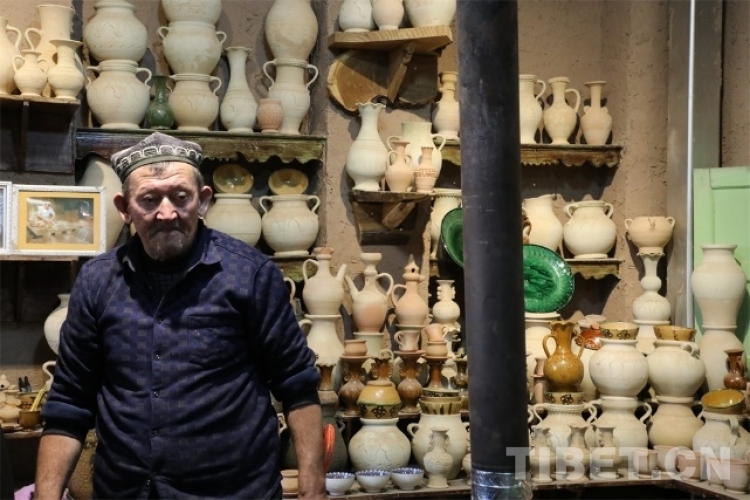 深入高臺民居的內部,就可以找尋到現存的土陶人家。步入這個安靜的小院,各式各樣的土陶制品立馬映入眼簾。土陶人家的店主吐爾遜·肉斯塔木是國家級非物質文化“模制法土陶燒制技藝”的第七代傳承人,他從17歲開始獨立工作,如今68歲的他依舊挽起袖管,非常投入地沉浸在土陶工藝的創作世界里。