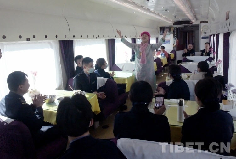 首次進(jìn)藏的著名歌唱家、協(xié)會(huì)公益愛(ài)心大使黃春燕在從拉薩到那曲的列車(chē)上為“天路”列車(chē)員演唱膾炙人口的《天路》之歌(唐召明2023年12月25日攝)