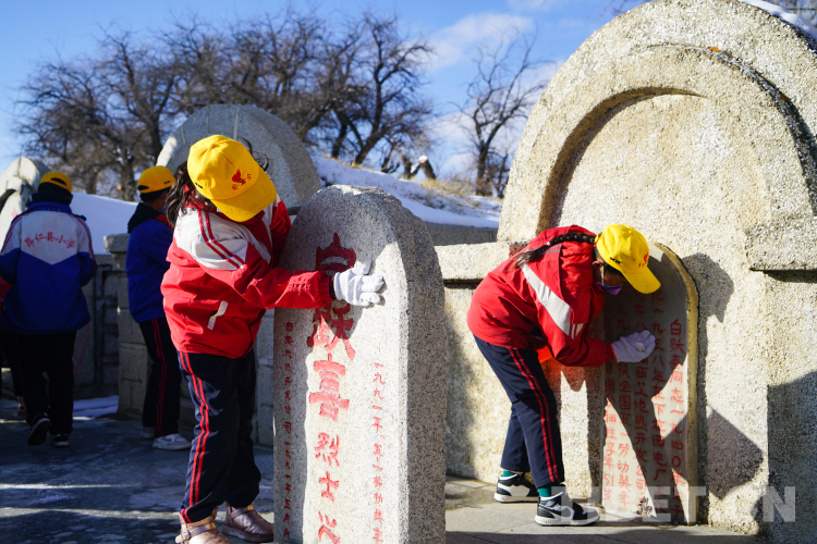 圖為多白鄉小學生在拉薩市烈士陵園內擦拭烈士墓碑 攝影:趙振宇