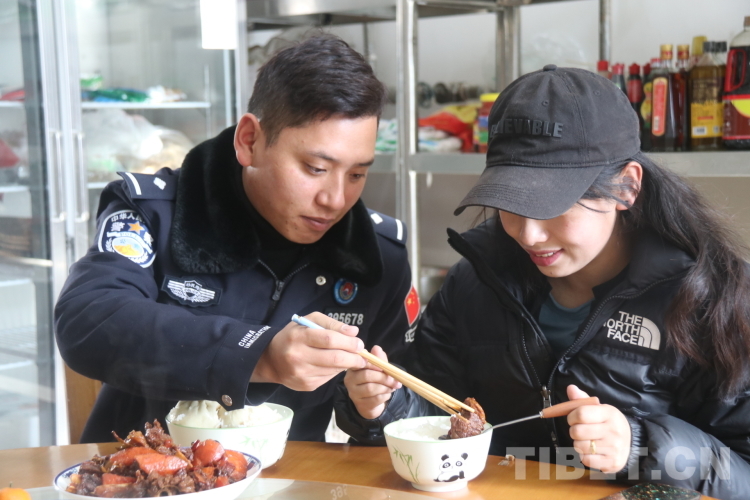氧氣瓶、高原藥品、熱水......接德吉永措的車上已準備好了各種抗高反和取暖的東西,這讓她提前感受到了來自丈夫單位的熱情與關懷。與愛人相聚后,旦增洛追帶著妻子參觀營區,迫切地想讓她了解他用青春為之奮斗的警營,隨后他又帶著妻子到單位食堂品嘗自己親自下廚做的紅燒肉。“嗯!味道很好。”德吉永措吃著丈夫給她夾的肉,臉上洋溢著幸福的笑容。