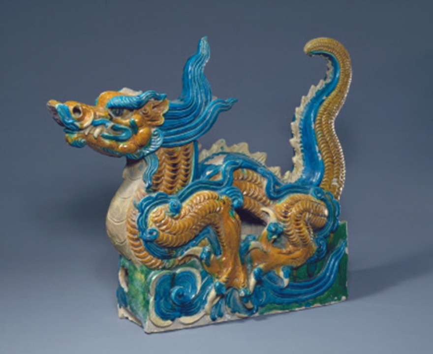明代的三彩琉璃龍形建筑構件,高64 厘米,長76 厘米。此建筑構件應是安置在宮殿垂脊前面的垂獸。垂獸,也有人稱為“角獸”,指的是中國古建筑屋頂垂脊或角脊端部的獸形構件,多用在廡殿頂、硬山頂與歇山頂上,起固定瓦片的作用。