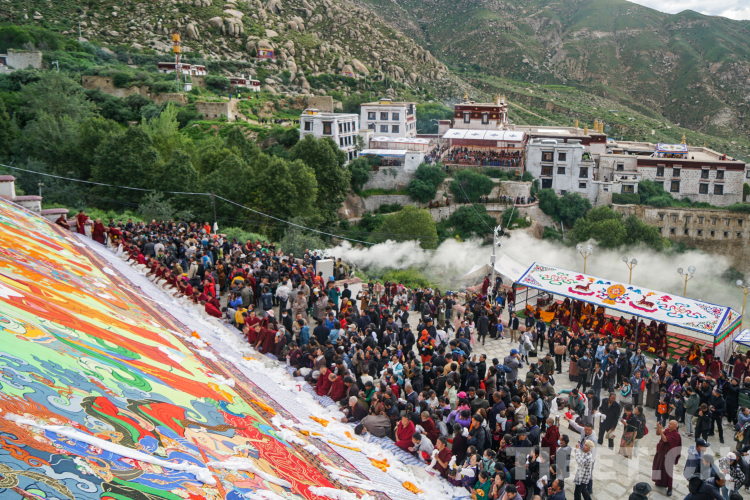 圖為2023年拉薩雪頓節哲蚌寺展佛現場。雪頓節距今已有近千年歷史,近年來雪頓節在各級政府的保護和發展中,已從單純的民俗文化節日成為集傳統展佛、體育競技、文藝匯演、經貿洽談、商品展銷、旅游推介、民俗體驗等為一體的復合型節日。 攝影:趙振宇