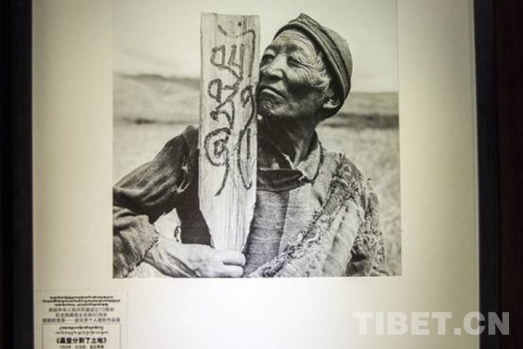 珍貴的照片《桑登分到了土地》拍攝于1959年,身世悲苦的老農奴桑登,在分到土地那一天,他把那象征分土地的木牌緊緊地貼在臉頰上,這個木牌上寫著藏文:桑登田。