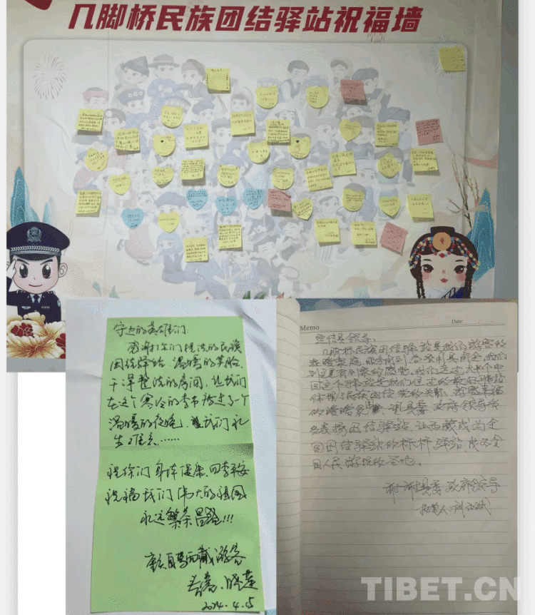 記者在社交媒體上也看到了很多游客以視頻、圖文等形式分享了他們和幾腳橋民族團結驛站的故事。“因為當地特殊原因我們到縣城沒有地住了,在小紅書上看到這個驛站可以留宿,實在沒有辦法去邊防檢查站詢問。邊防小哥哥了解原因后特別暖心立馬給我們安排住宿,洗漱用品樣樣不差,太贊啦!這是我這一路旅行睡得最香的一晚,主要還免費!”一位游客半調侃地分享了自己的故事,還加了三張夜拍驛站的圖片。一張用外景,在夜里,“幾腳橋民族團結驛站”漢藏雙語大牌十分醒目;一張室內環境,左右兩邊的上下鋪床上放著四個“豆腐塊”被子,床單潔白如新,中間的小桌子上還放著氧氣罐、雜志、臺燈等用品;一張貼滿祝福與感謝的“便簽墻”……張張圖片體現了驛站工作人員的用心良苦,也定格著他難忘的定結記憶。